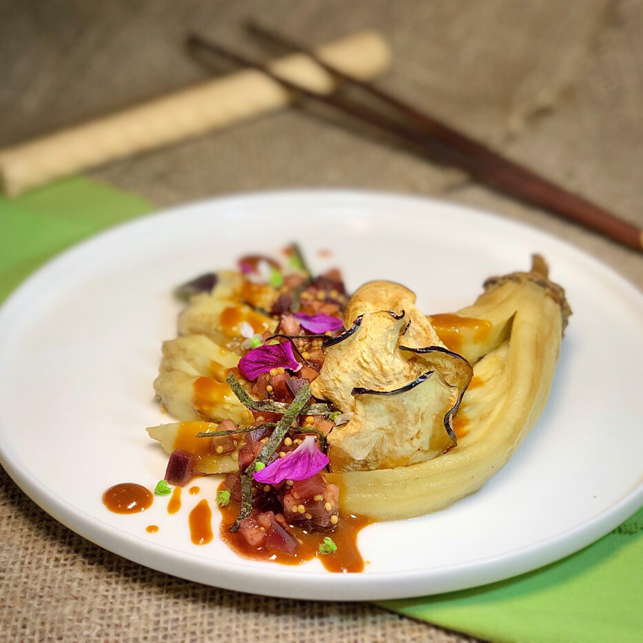 Для горячей закуски внимательно изучили японские Якинасу в современном прочтении, где рыбную часть мы заменили веганскими прелестями из баклажана.