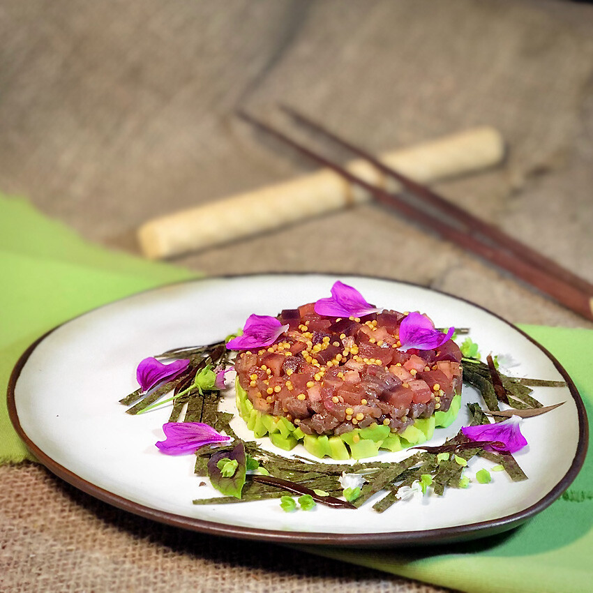 6. Тартар мясной с баклажаном и авокадо