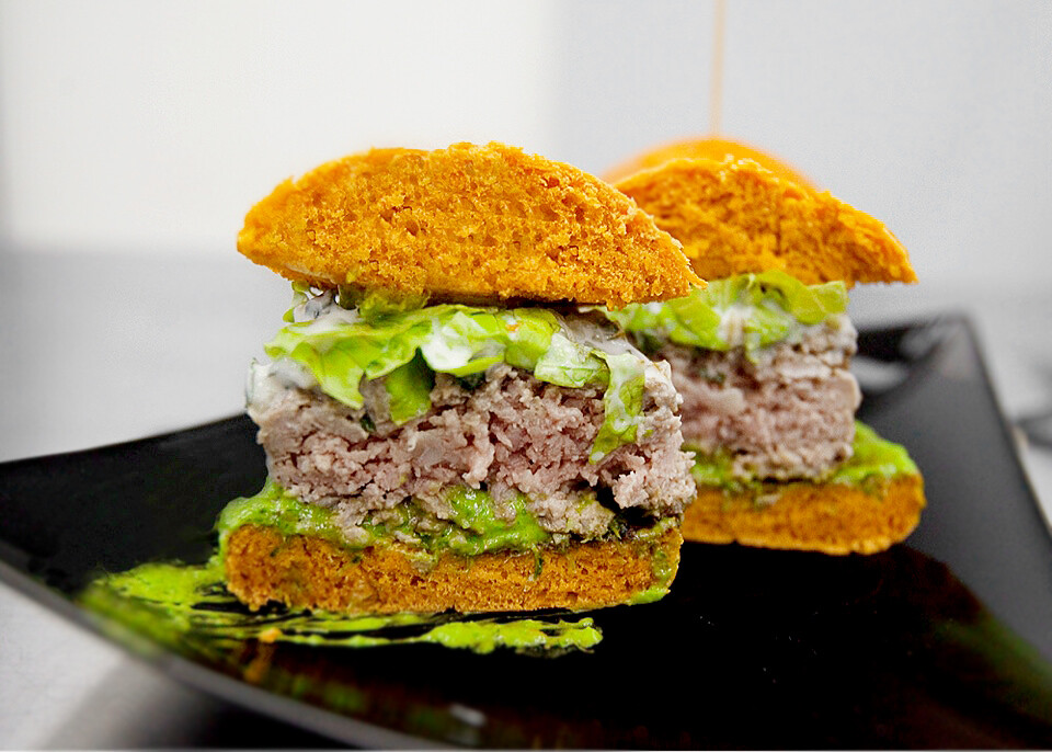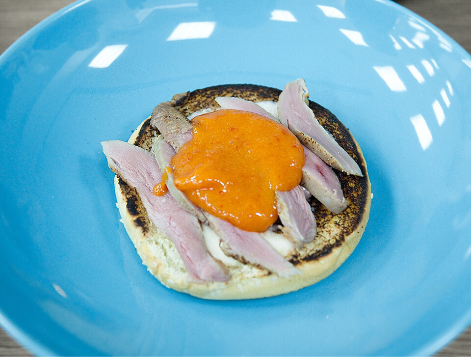 - утиный бургер с двумя необычными соусами,