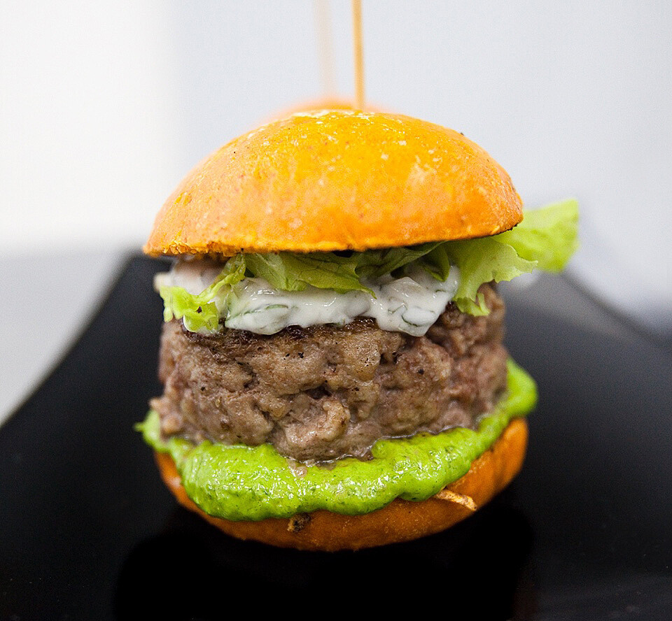 - бургер с котлетой из ягнёнка в оранжевой булочке.