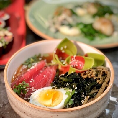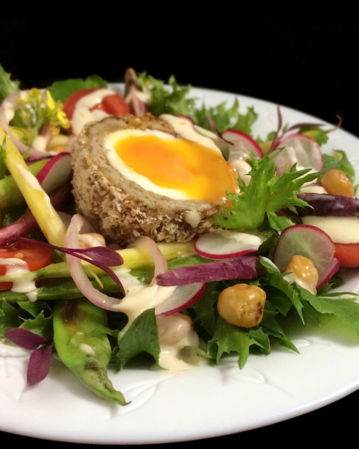 - Салат с перепелиными пашотами и сувидной перепёлкой