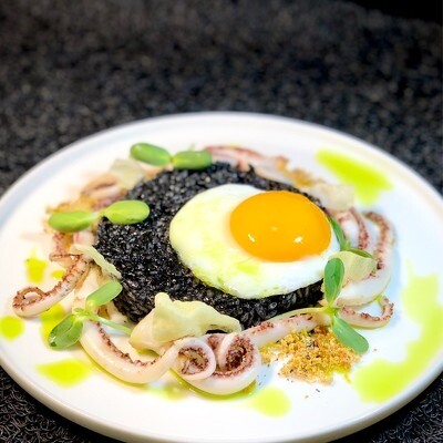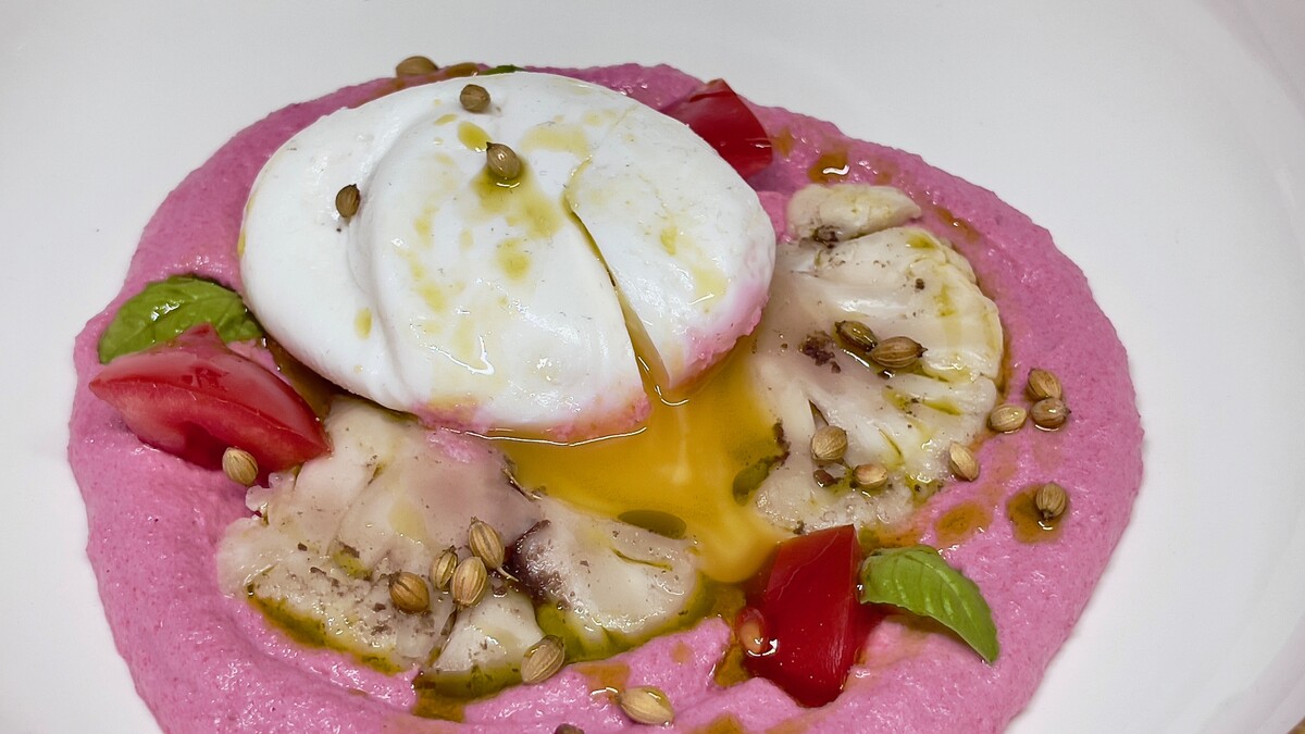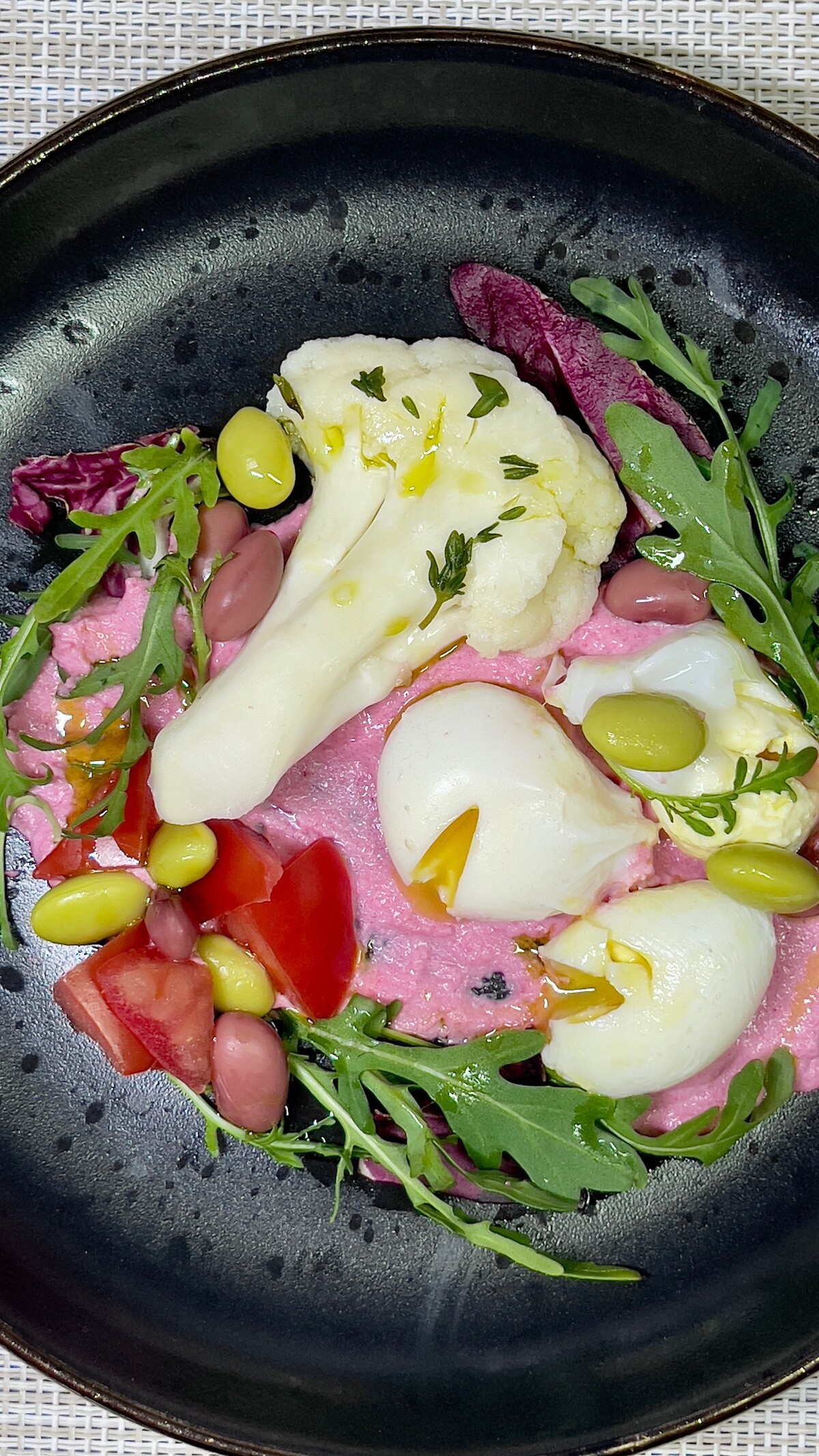 - Яйцо пашот с цветной капустой и розовым капустным муссом