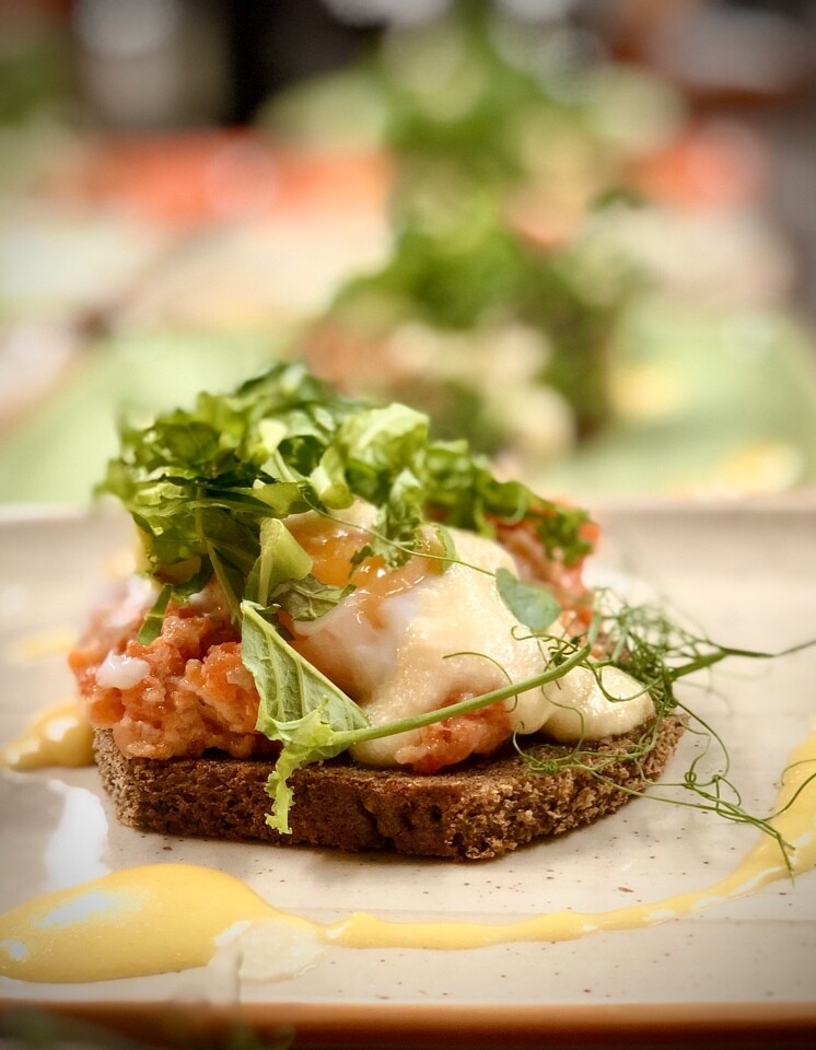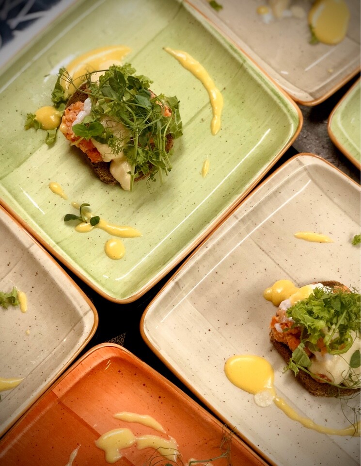 - Яйца Бенедикт с рийетом из двух видов рыбы с двумя голландскими соусами — белковым и желтковым. Рийет фантастический, не бледный и не грубый. Он пышный, сочный и текстурный. На тостах с яйцом пашотом и необычным голландским соусом на белках. Роскошь, помноженная на умные технологии.