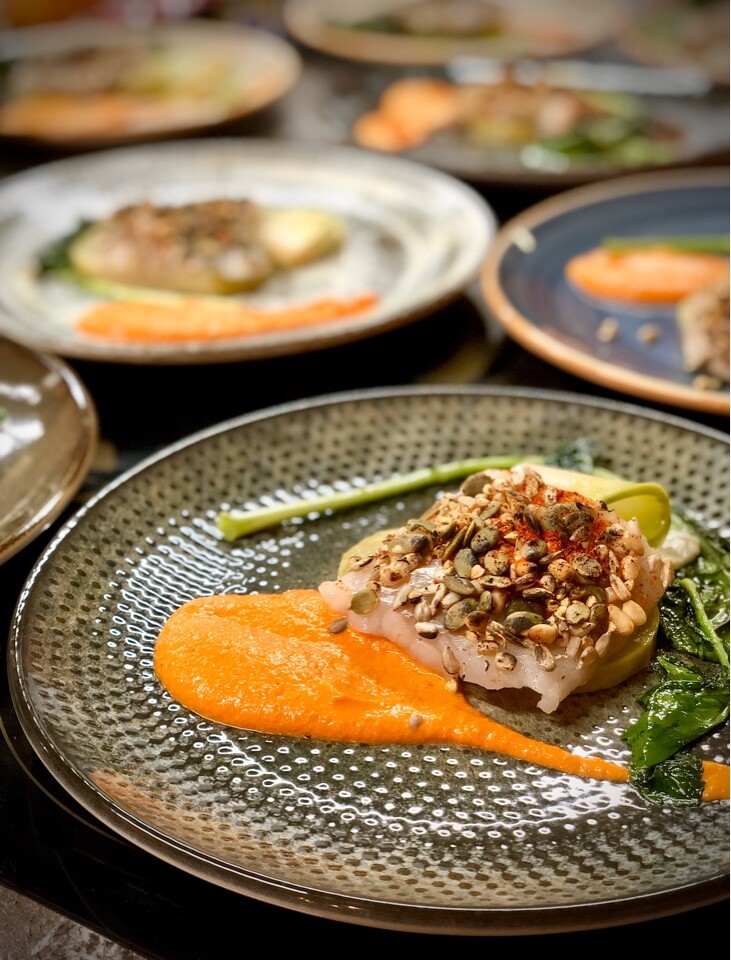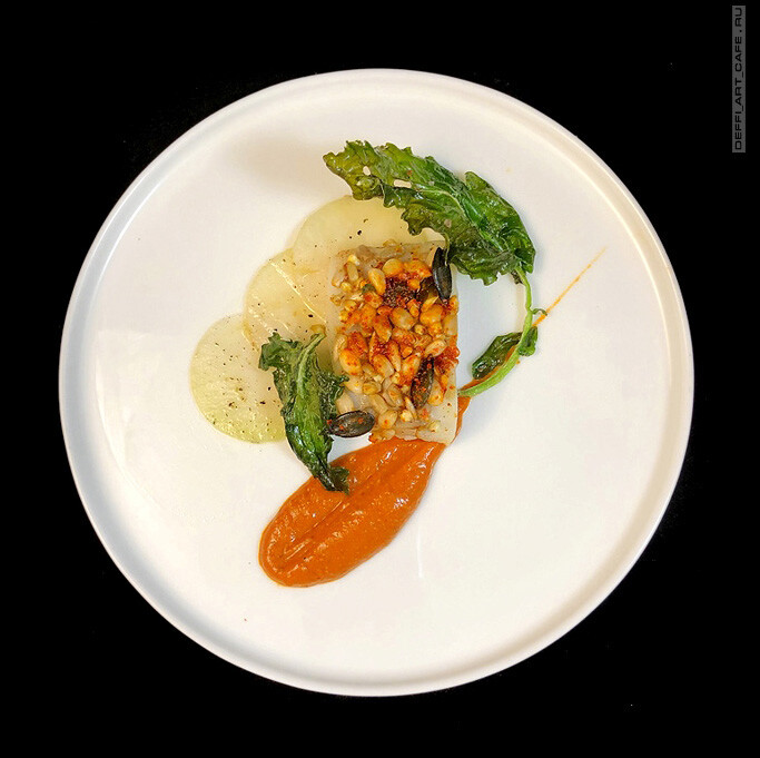 - Треска Амандин по-новому. Особым образом приготовленная, треска идеально держит форму. Нежнейшая, с хрустящим покрытием из богатой смесьи орехов, семян и злаков, с кольраби тремя способами и перечно-ореховым кремом.