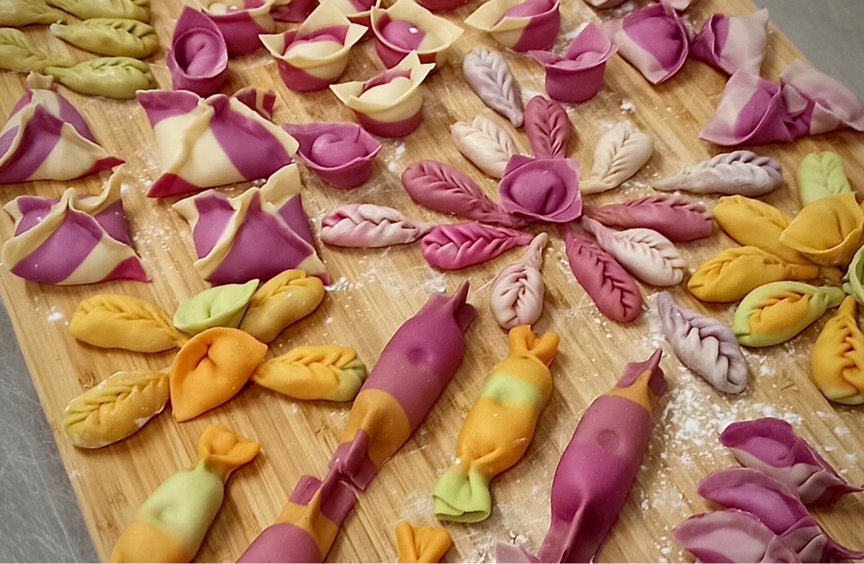 Здесь мои авторские техники — формулы белого, цветного и безглютенового теста. Итого 25+ формул. Авторский декор (рисуем тестом по тесту), 25+ формовок и самые небанальные начинки, гарниры и соусы. Моё цветное тесто по моим формулам никогда не вываривается.