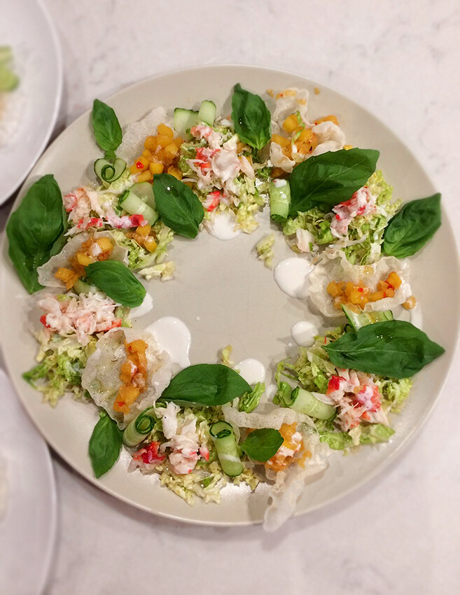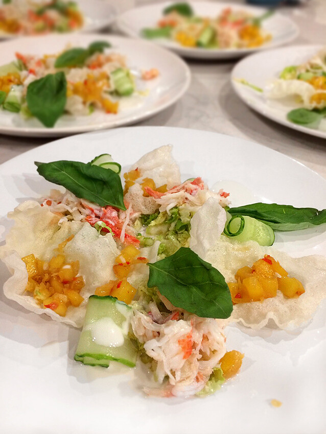 Например, изысканный салат с крабовым мясом, рисовыми пуффами, манговым чатни и кокосовым соусом готовится с нуля максимум за 30 минут, что идеально для праздничного стола. Если же заготовить чипсы, соус и чатни накануне праздника, то время сократится до 10 минут.