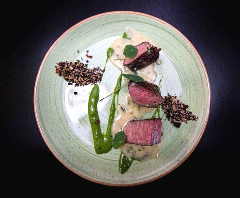 - умные Стейки обогатили шоколадным Беарнезом и шоколадно-ореховым крамблом.