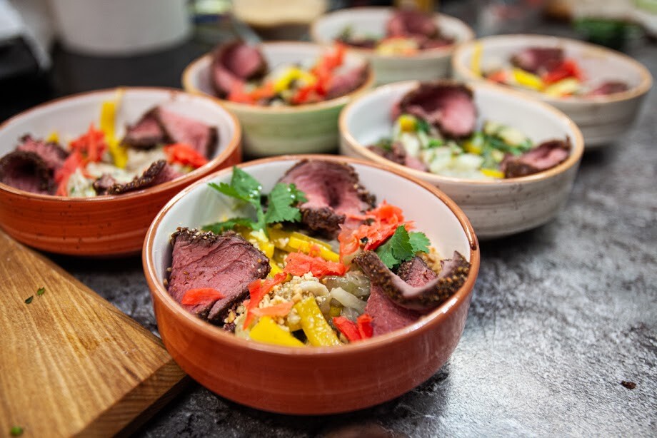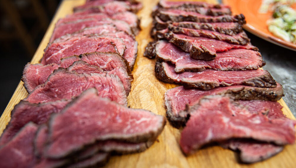 Sirloin Top Batt – это крупные (2,5 кг) отрубы из верхней части костреца. Мы их красиво разобрали на стейки, ростбифы и тартар и приготовили в четырёх совершенно разных национальных стилях. Было Море Мяса – сырое, полусырое, жареное, запечённое и су вид.