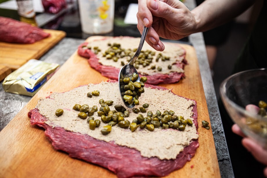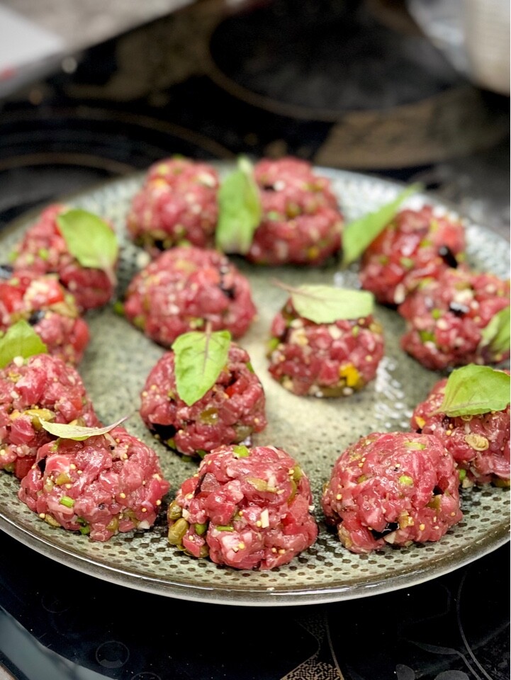 - европейский тартар обогатили сливой, каперсами и зёрнами горчицы,
