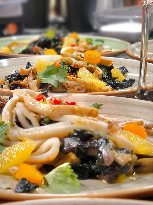 | 1. Черные шалаталли с капонатой, кальмаром и апельсином |