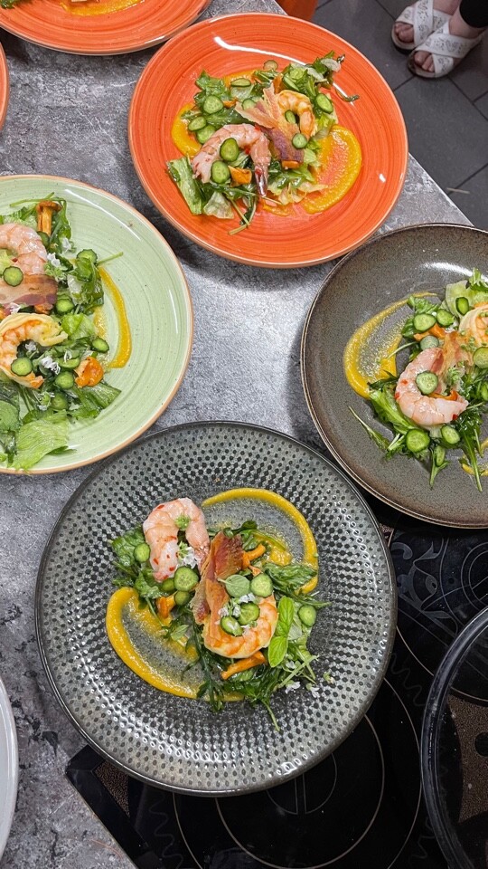 - Сначала Креветки появляются в салате в трёх ипостасях + небольшой штрих в виде беконного чипса, а бэквокале лисички первым способом.