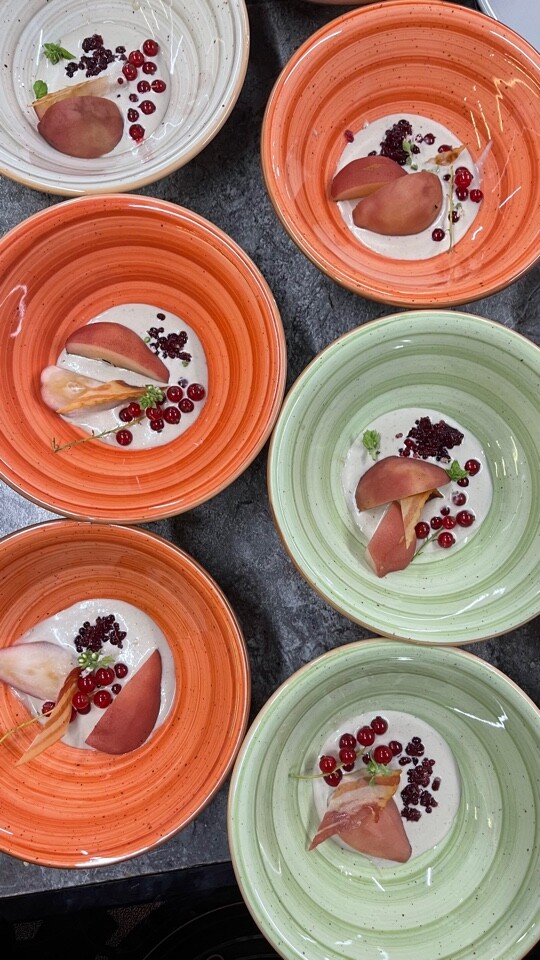 - Уже в десерте Тема винной Груши максимально развивается и логично усиливается жемчужинами из глинтвейна, соусом горгонзолла-кокос-леморграсс и финальным мясным чипсом.