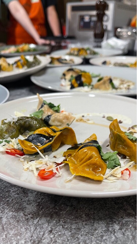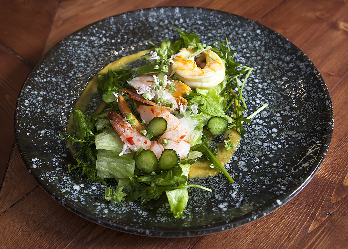 - Затем в горячей закуске баланс Корейки и Креветок выравнивается за счёт начинки + появляется азиатский акцент — соус кокос-лемонграсс.