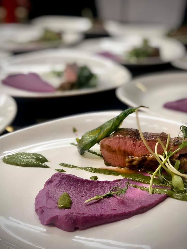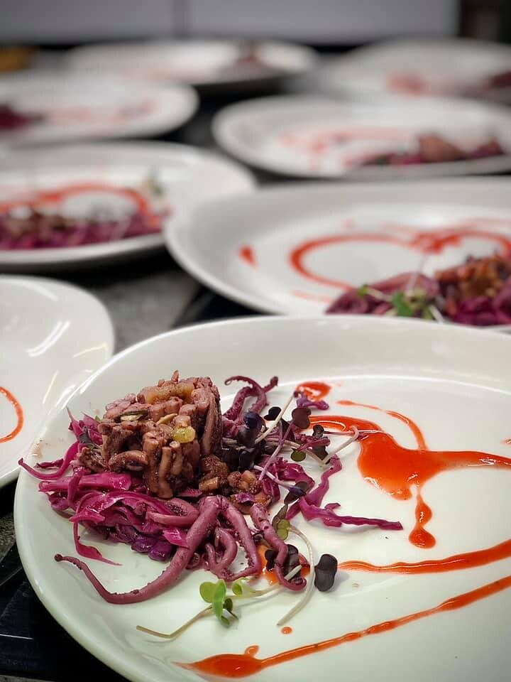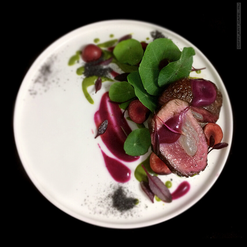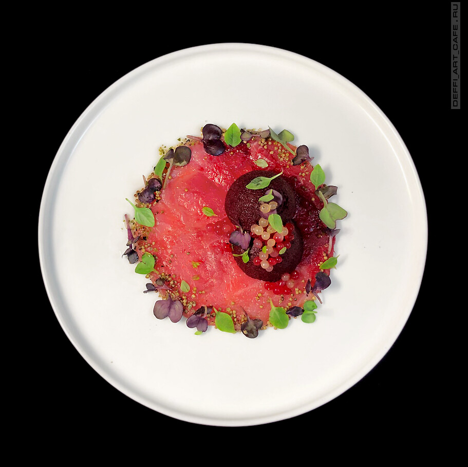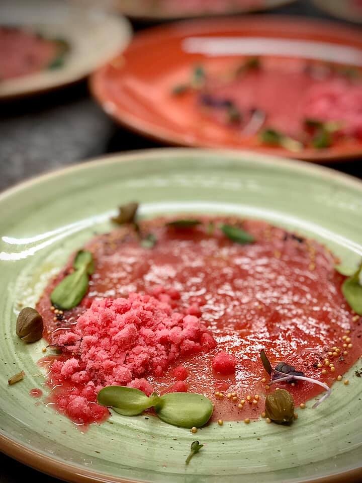 Меню я задумала так, чтоб было максимум красного, розового и оранжевого - всего самого темпераментного, солнечного и сицилийского. Лишь немного фирменного соуса Сальмарильо и микрозелени. Было много красных и оранжевых апельсинов - в граните, в соусах и заправках, в гарнире к мясу. Много красной капусты, щупалец в вине, свекольное мороженое, имбирные розовые жемчужины.
